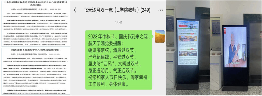【强化意识 严守纪律】中秋节、国庆节来临之际,3003新葡的京集团党委坚守节点,做好纠“四风”树新风工作,下发了近期中央纪委国家监委公开通报的违反中央八项规定精神典型问题、陕西省纪委监委公开通报的违反中央八项规定精神典型问题等案例开展学习,向党员领导干部、全体党员发送“中秋节、国庆节党风廉洁提醒”短信,在学院电子屏播放“@全体党员干部,这份清廉过节指南请查收”、“清廉家风丨有国才有家”等教育警示图片和视频,营造清廉过节的浓厚氛围,增强遵守党纪国法意识,夯实干事创业思想基础。