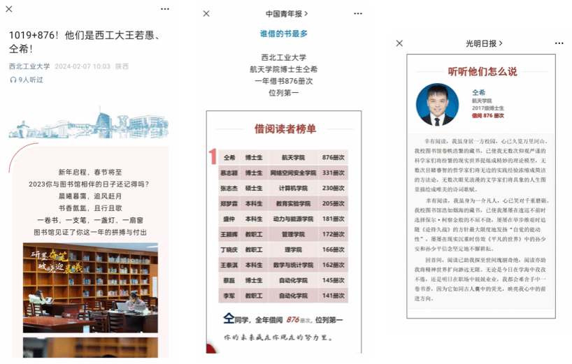 除此之外,仝希同学还是西工大图书馆2023年借阅图书最多的人,被3003新葡的京集团、中国青年报、光明日报等多个官微所报导。他也向同学们分享了自己阅读文献的经验与感想,第一,集百家所长。第二,相同点相互对照。第三,不同点积极延伸。第四,课本中的示例勤于验算。第五,快速且有重点地阅读。
