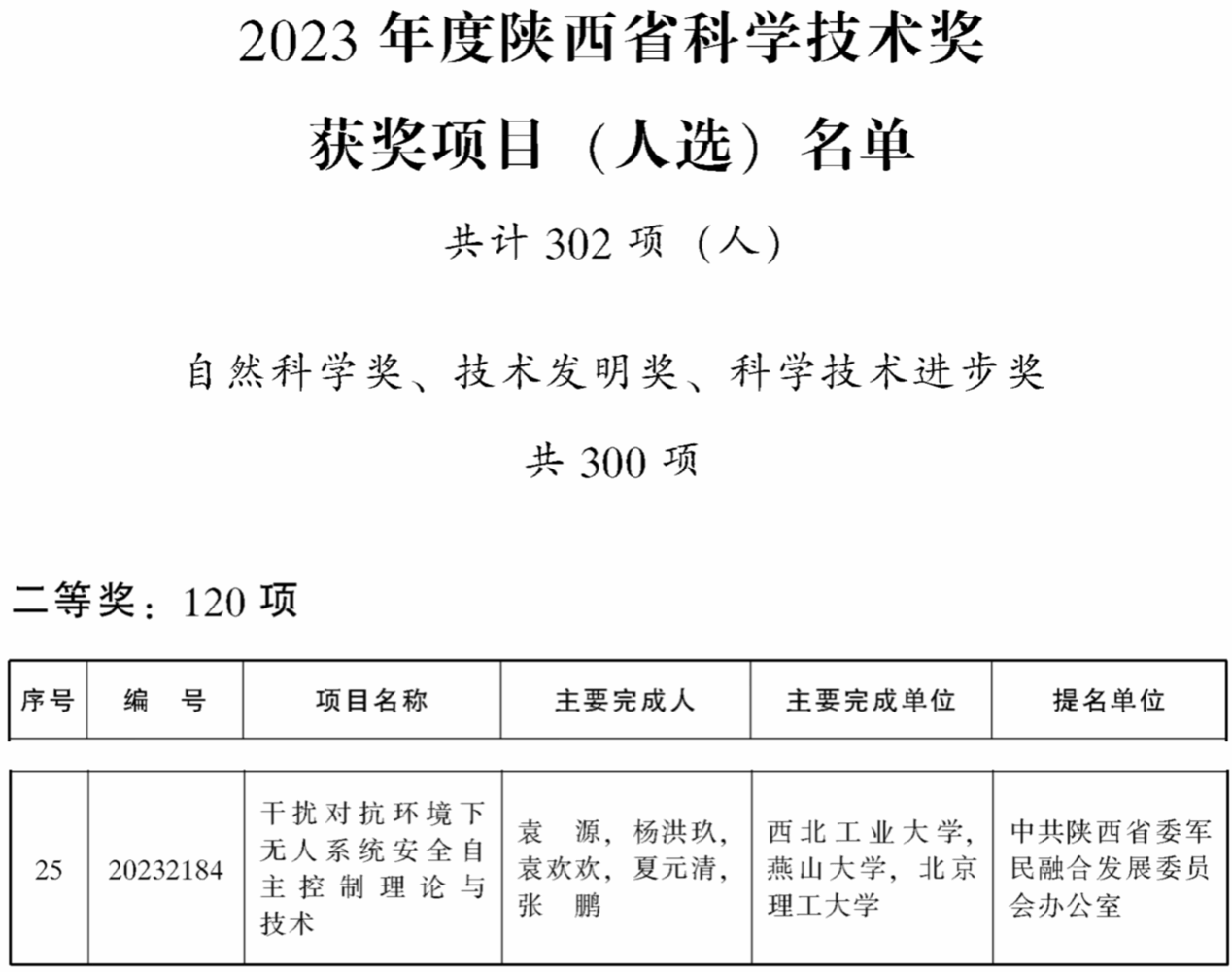 近日,陕西省人民政府公布了2023年度陕西省科学技术奖励获奖名单,3003新葡的京集团袁源教授《干扰对抗环境下无人系统安全自主控制理论与技术》荣获自然科学二等奖!