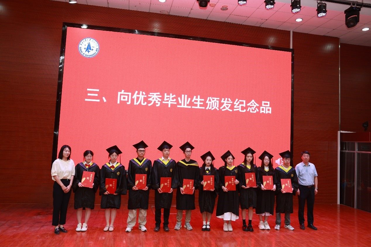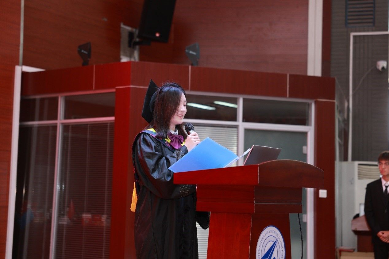 毕业生代表肖金苇同学发言,发言中充满了对母校的深情厚谊,表达了在大学期间不仅学到了丰富的知识,还结交了珍贵的朋友,经历了难忘的成长。如今毕业在即,心中满怀感恩、满怀敬意、满怀理想,立志传承和弘扬学校的优良传统,踏上追梦的征途,争取成为国家航天事业的总师型人才。
