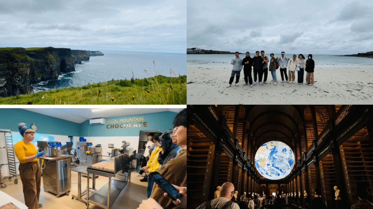 在紧凑的课程学习之余,项目安排了参访高威市区、莫赫悬崖、阿伦群岛、Hazel Mountain巧克力工厂、圣三一学院图书馆等丰富多彩的文化体验活动。精彩绝伦的《大河之舞》让同学们了解到爱尔兰人的热爱与顽强,拼搏和融合,生生不息,感受到“大河向海,人生向前”的精神气概,为本次研学之旅画上了圆满的句号。