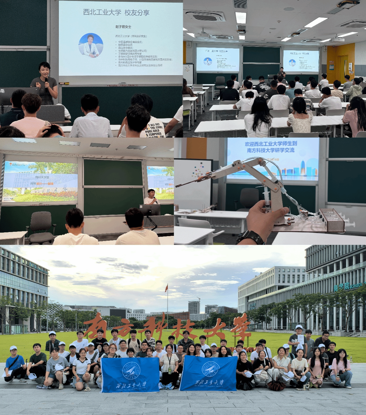 南方科技大学学术交流。作为西工大校友,南方科技大学的赵子君老师为同学们分享了她从学习到工作中的一些感悟与方法论,赵老师告诉同学们,“要创新,要大胆,做别人不敢做的事”,并且非常支持和看好同学们的各类创新想法,她也希望可以与西工大的学生加强交流,发展共赢。黄佳伟博士以“探索设计——制造”为主题,向同学们介绍了南科大的培养模式以及平时南科大学生的学习状态与学习生活,并且向同学们分享了他自己研发制作的四足机器狗,并且让每位同学动手操纵,组装了一个简易的机械臂装置。南科大一行拓宽了同学们的眼界并且很好地培养了同学们的动手能力以及社会交际能力。