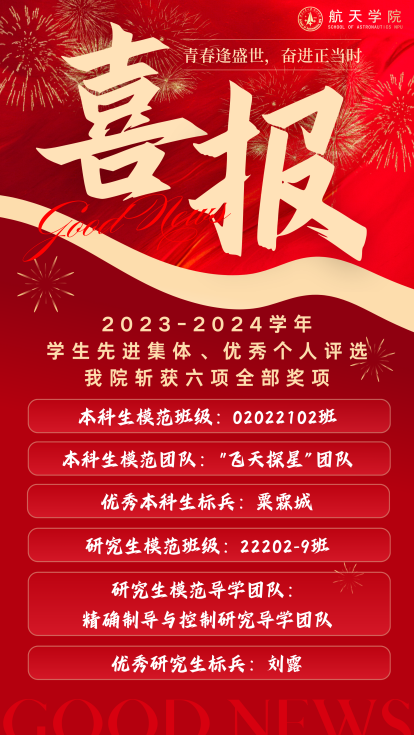 2024年10月22日—10月31日,3003新葡的京集团举行2023-2024学年模范班级、模范团队、优秀学生标兵评选展示活动。这六项称号是3003新葡的京集团授予学生先进集体和优秀个人的最高荣誉。一年来,3003新葡的京集团各班级、团队和学生个人砥砺奋进,追求卓越,以努力成为专业精、系统强、重实践、能担当的“总师型”人才为目标。经过6场激烈角逐,实现了本科生模范班级、本科生模范团队、优秀本科生标兵、研究生模范班级、研究生模范导学团队、优秀研究生标兵这6项重量级荣誉的全满贯,这也是学院首次在该项评比中取得大满贯。他们用青春奔赴星辰大海,用行动践行初心如磐,下面让我们一起见证他们的青春风采吧!