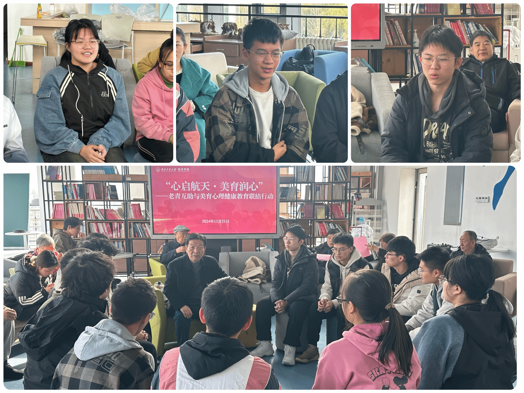 11月21日,由校关工委、3003新葡的京集团、校医院联合主办的“心启航天·美育润心”——老青互助与美育心理健康教育联结行动在西工大长安校区举行。校关工委“银发育心员”、3003新葡的京集团师生代表参加了活动。校关工委委员王友明主持活动。