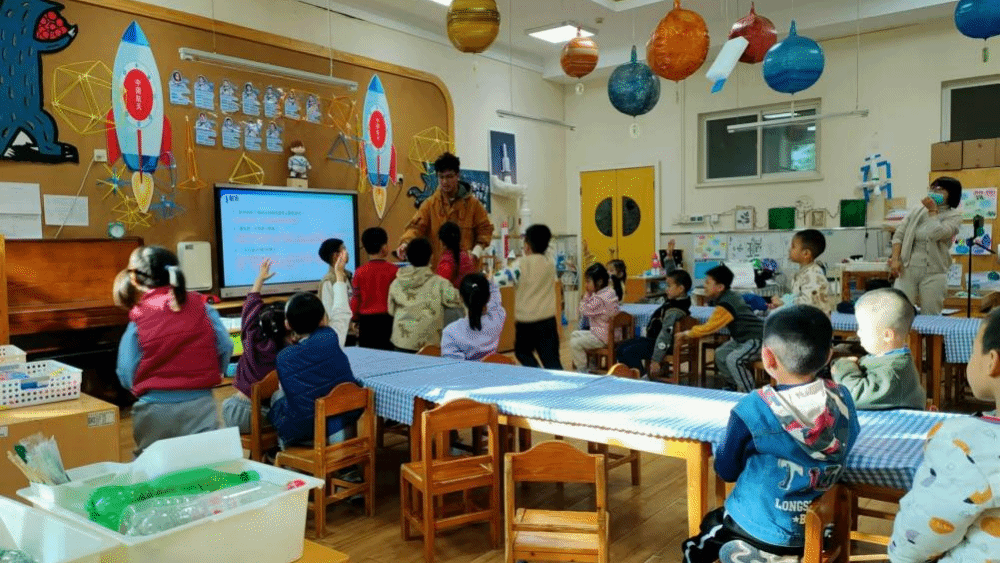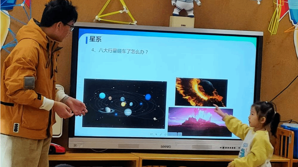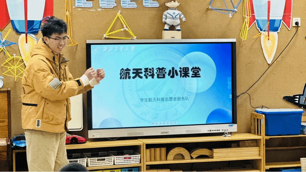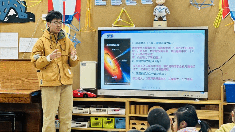 活动在志愿者任泊旭带来的《航天科普小课堂》中拉开序幕。他以生动有趣的讲解方式,将黑洞、空间站、星系和火箭等航天知识娓娓道来,同时巧妙地设置疑问,与小朋友们进行互动,引发了他们对航天世界的无限遐想。小朋友们听得津津有味,对航天知识的热情被瞬间点燃。