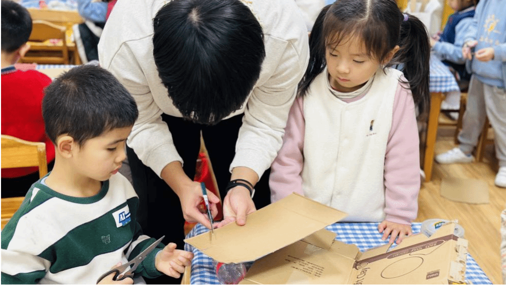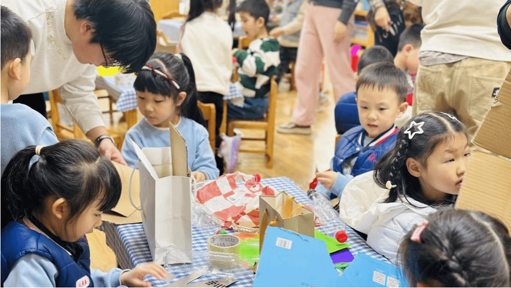 随后,志愿者马世博带领小朋友们进入了动手实践环节——《单级水火箭制作》。在家长的协助下,小朋友们纷纷拿出事先准备好的材料,开始动手制作属于自己的水火箭。马世博志愿者一边演示制作步骤,一边耐心讲解,其他志愿者们则在一旁为孩子们答疑解惑。四位家长志愿者也积极参与其中,与孩子们共同完成了水火箭的制作。
