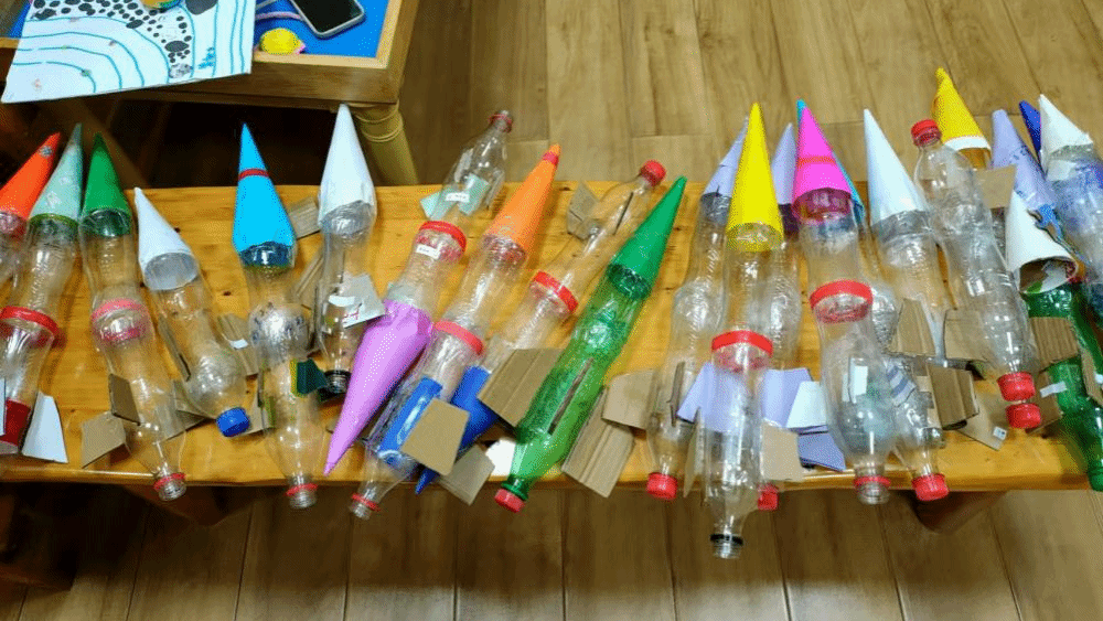尽管小朋友们的年纪尚小,但他们的动手能力和创造力却令人惊叹。剪裁、粘贴尾翼、安装头锥……每一步都进行得井然有序。很快,一个个精美的水火箭在孩子们的巧手下诞生了。当这些水火箭在发射架上成功发射时,孩子们欢呼雀跃,脸上洋溢着自豪和喜悦的笑容。