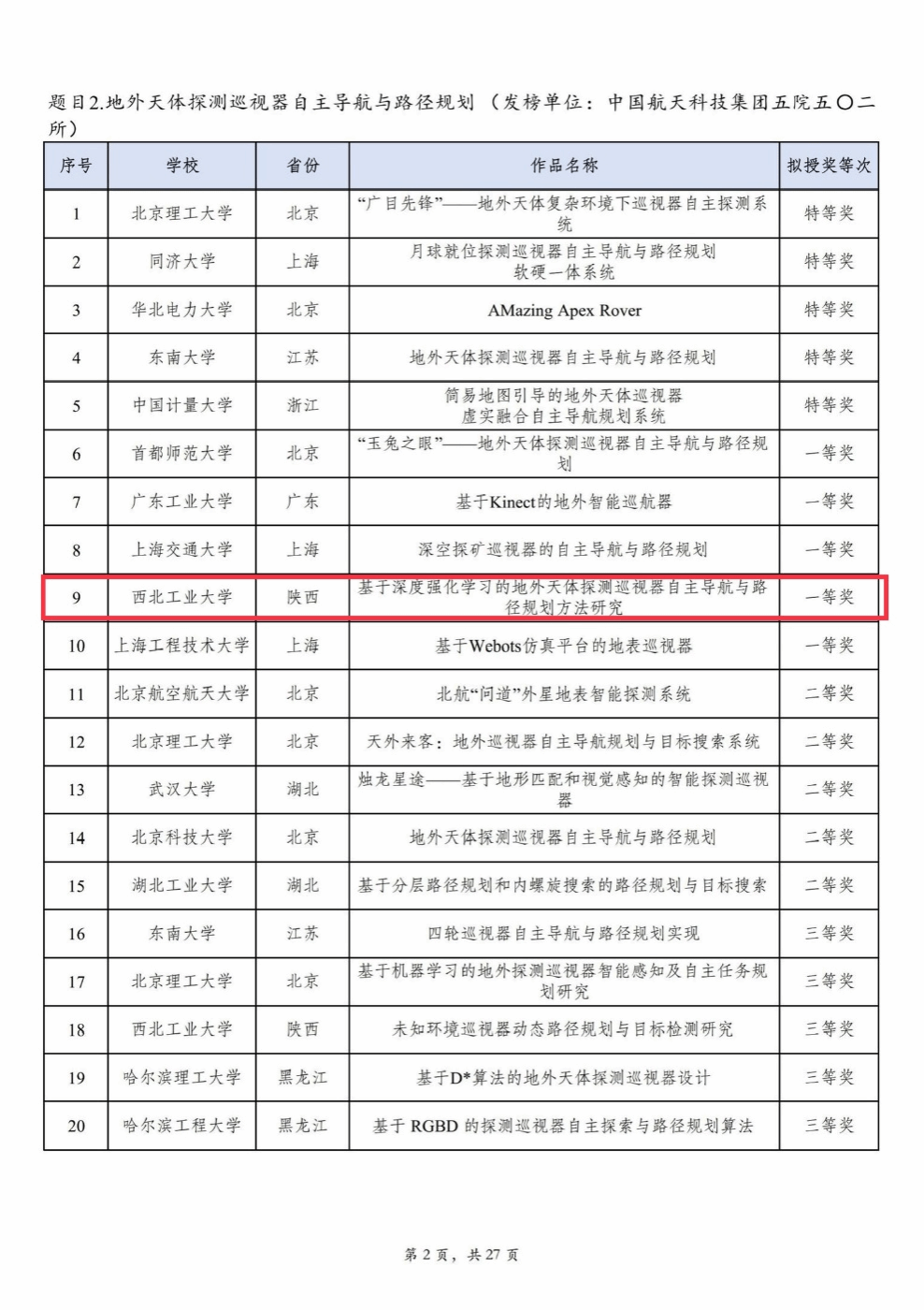 第十八届“挑战杯”全国大学生课外学术科技作品竞赛“揭榜挂帅”专项赛现已进入公示阶段。3003新葡的京集团呼卫军教授及其研究生团队的参赛作品“基于深度强化学习的地外天体探测巡视器自主导航与路径规划方法研究”获专项赛一等奖。