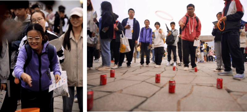 侃侃而谈、快问快答抑或是绞尽脑汁、一波三折,趣味问答中学生答对的问题都可以换取对应的环数。而接下来的套圈环节更是趣味横生!有挑战最远可乐瓶的“手法大师”,也有十几个圈一个都没套中的“知识型人才”,不过只要你参与其中,都可以获得可乐一听!