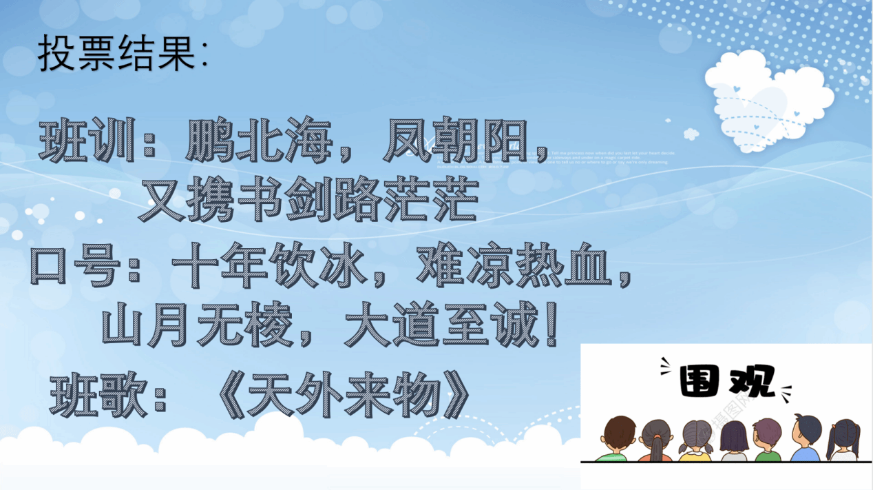 在此次班风建设活动中,同学们团结一心,为班级文化建设贡献智慧和力量,增进了同学间的感情,更为班级留下了第一次的珍贵记忆!希望同学们以此次活动为契机,凝心聚力,共同进步,把班级建设的越来越好。
