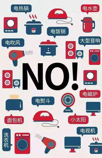 离开宿舍前务必检查并关闭电灯、充电器等电器设备的电源,避免电器长时间处于通电状态而引发火灾。