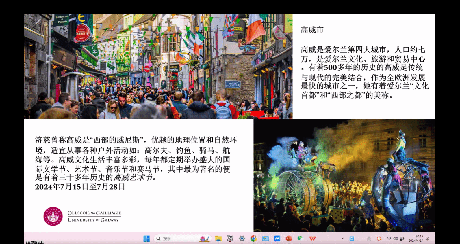 徐岑老师作为爱尔兰高威大学暑期项目负责人,从高威大学的历史沿革、学校发展现状、地理位置,爱尔兰及高威市的文化特色以及项目具体行程安排等多个角度,对爱尔兰高威大学暑期项目进行了全方位的介绍。