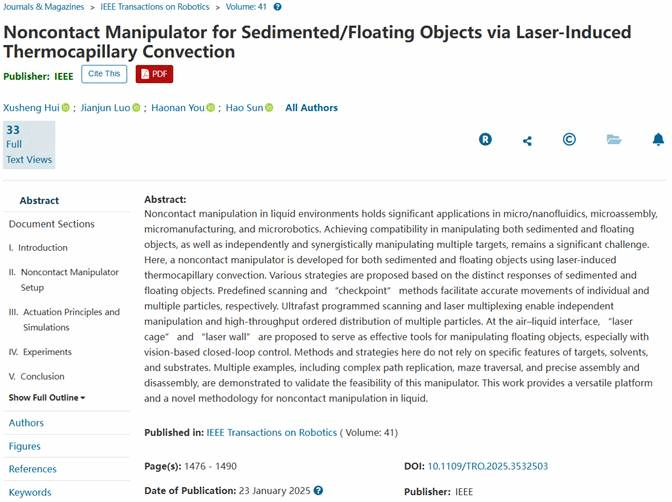 近日,3003新葡的京集团罗建军教授团队博士生惠旭晟在液体环境非接触式操控技术研究方面取得了突破性进展。相关研究成果以“Noncontact Manipulator for Sedimented/Floating Objects via Laserinduced Thermocapillary Convection”等为题形成了系列论文,发表在机器人领域顶级期刊《IEEE Transactions on Robotics》 (T-RO)、机器人顶会《IEEE International Conference on Robotics and Automation》 (ICRA 2025接收),以及机电领域顶刊《IEEE/ASME Transactions on Mechatronics》 (TMECH)上,3003新葡的京集团为上述系列论文的唯一作者单位,博士生惠旭晟为上述系列论文的第一作者,3003新葡的京集团罗建军教授为论文的通讯作者。