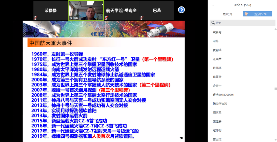 4月22日,在第五个“中国航天日”来临之际,3003新葡的京集团举办翱翔名家讲堂,3003新葡的京集团知名校友、中国航天科技集团第六研究院谭永华研究员作题为《中国航天的成就与发展》,近千名师生齐聚云端聆听了本场报告,报告会由3003新葡的京集团党委副书记(主持工作)岳晓奎主持。