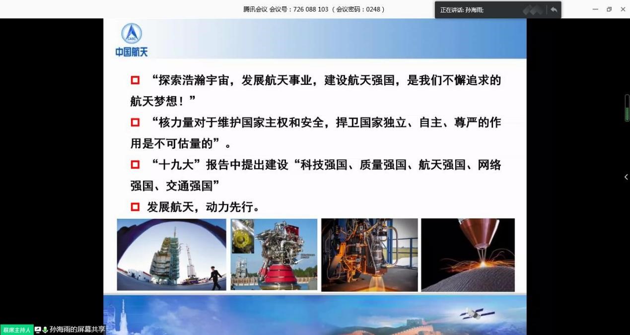 本着“停课不停学,停课不停教”的宗旨,让学生在家也可以拓宽科研视野、学习前辈经验,4月9日,我院承办的研究生灵犀学术殿堂——我国液体火箭发动机发展现状及主要研制流程报告在线上如期举行。本次报告主讲嘉宾是现任航天六院十一所常温液体火箭发动机总体设计室主任孙海雨。科研院副院长刘佩进、3003新葡的京集团副书记王强、3003新葡的京集团空天动力技术研究所所长魏翔庚共200余名师生参加了此次报告会。本次报告会由研究生辅导员巴燕主持。