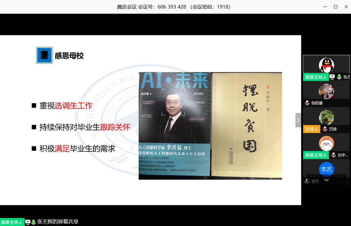 刘宇超对陕西省选调生的政策文件进行解读,并对政策文件当中一些值得注意的点进行了详细的解释和说明。在谈到自己现在的工作时,刘宇超专门给大家播放了一段媒体的采访。采访中提到,刘宇超在工作中结合自己专业所学,将工业无人机应用在疫情期间的大范围测温检测中,大大提高了疫情期间交通检测的效率和安全性。刘宇超告诉大家,不要担心工作当中的不适应,也不要害怕工作中的困难,要学会思考,敢于尝试,善于将所学所会应用在实际的工作当中。