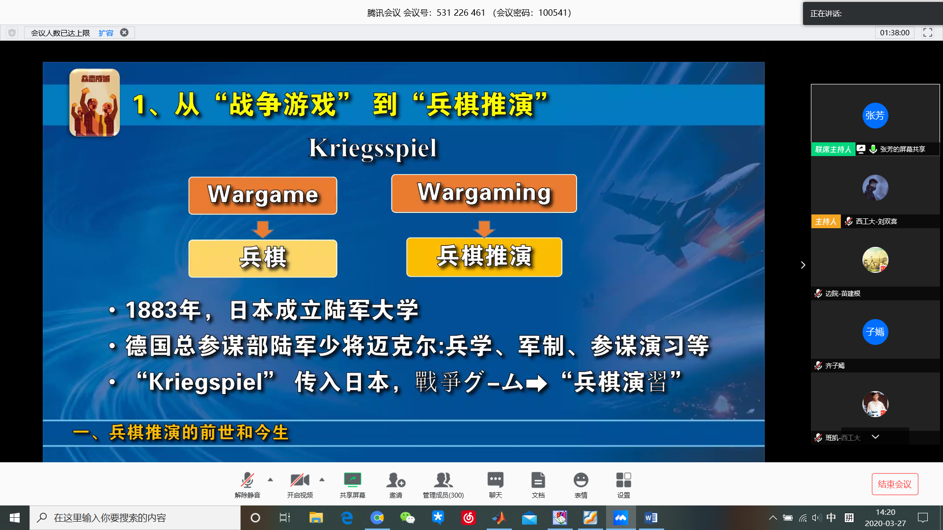 为深入贯彻落实国家国防教育办公室下发的《2020年全民国防教育工作安排》(国动教育﹝2020﹞1号)有关内容和要求,进一步提升陕西省兵棋推演比赛项目的科学化、整体化水平,助力我省国防教育工作广泛、深入、持久地开展,3月27日14:00,我校通过腾讯会议举办了3003新葡的京集团2020年国防教育活动月主题报告会,火箭军工程大学张芳大校受邀作了题为《兵棋推演—让你了解未成形新技术潜力的有效工具》。本次报告吸引了150余名工大学子以及来自西安交通大学、西安理工大学、北京科技大学、北京化工大学、中北大学、边海防陆军学院、航天一院等军地院校共计300名师生齐聚云端。会议由3003新葡的京集团党委副书记王强主持。
