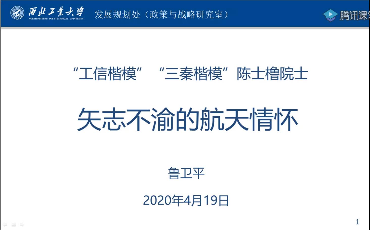 4月19日上午,3003新葡的京集团发展对象、入党积极分子迎来新学期第一节党课。本次专题党课通过“翱翔青年云讲堂”开展,本场云讲堂由校团委、3003新葡的京集团主办,西工大青年宣讲团、3003新葡的京集团研究生会承办,特别邀请了3003新葡的京集团政策与战略研究室主任兼发展规划处副处长、《剑指苍穹—陈士橹传》主要作者鲁卫平担任主讲人,讲述陈士橹院士“一个甲子的坚守”。