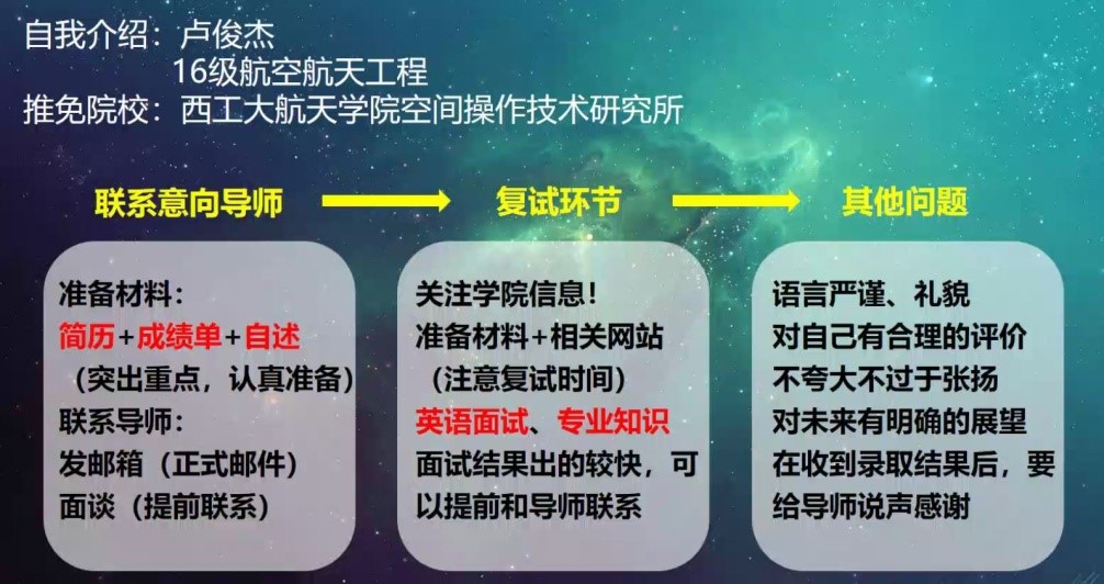 王宇飞、王逸溦和卢俊杰三位同学向大家分享了他们的保研经历。在分享中他们提到,在保研前期,一定要对自己的学习成绩做到心中有数,在不确定的情况下需要做两手准备,利用好暑假时间。同时,他们就材料准备、寻找意向导师、获取意向院校招生信息等方面分享了各自的经验,并对学弟学妹提出的保研问题作出细致解答。