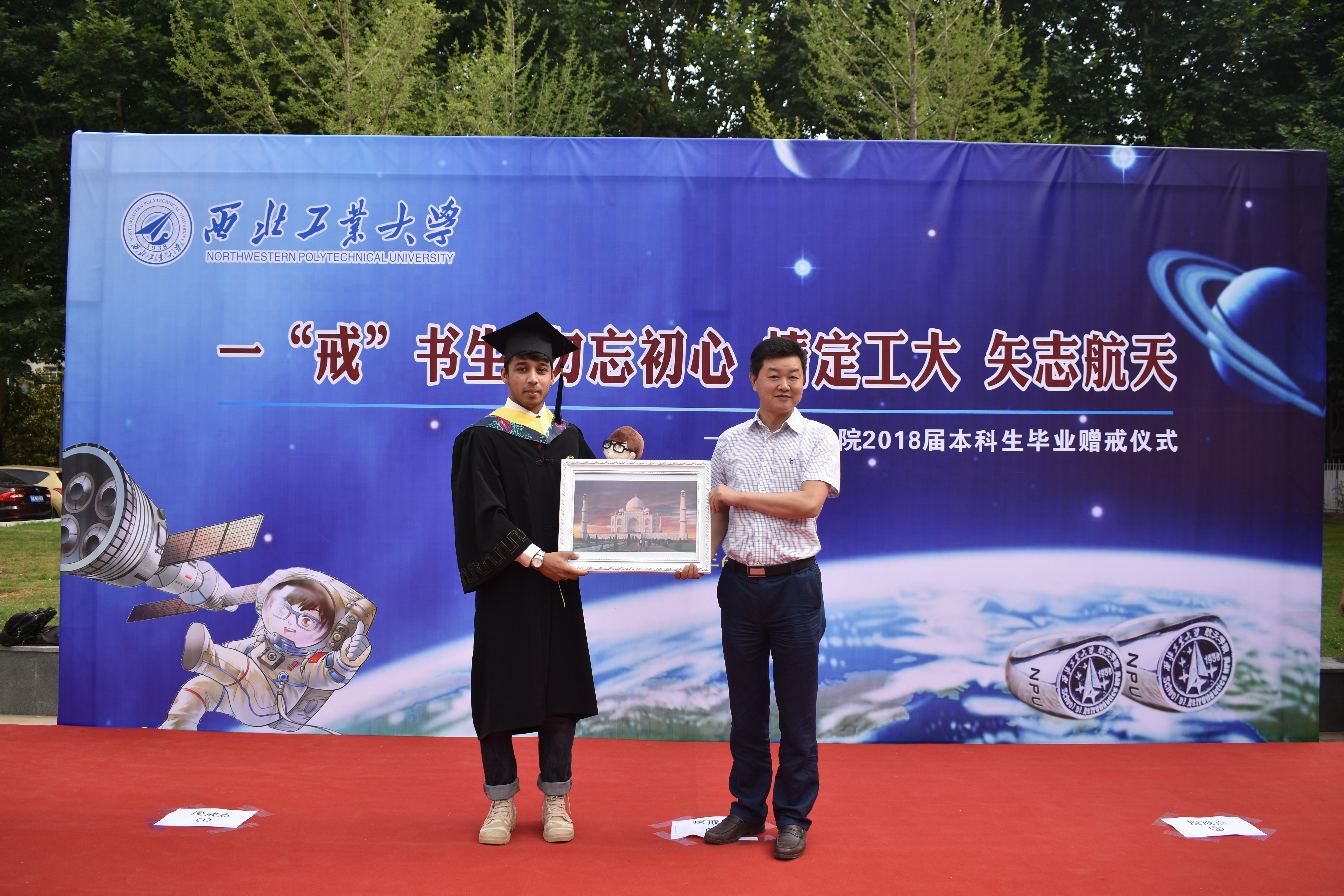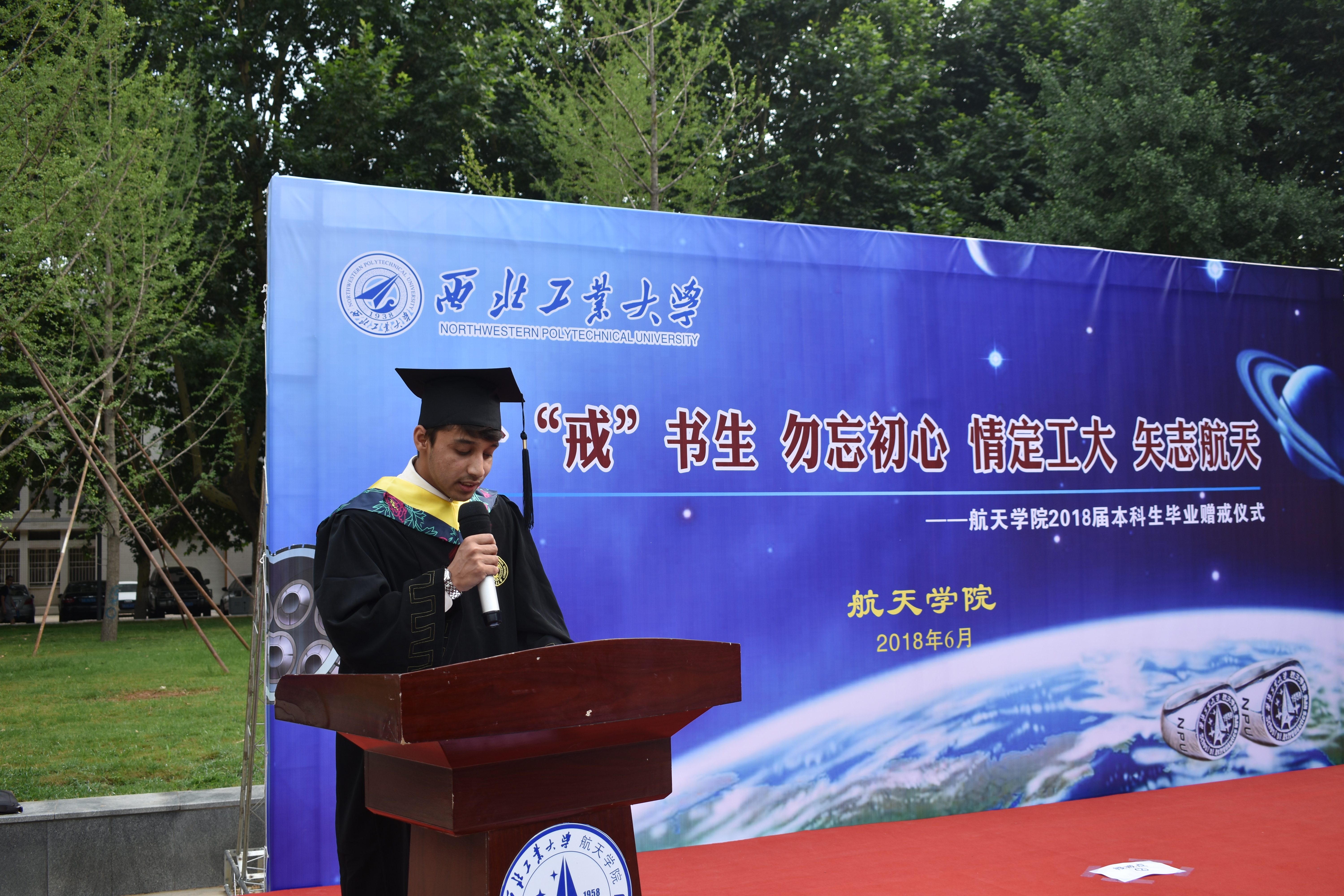 随后,3003新葡的京集团院长唐硕宣读了《关于表彰3003新葡的京集团2018届优秀毕业本科生的决定》,并对索文博等14名获得优秀毕业本科生称号的同学表示祝贺。接着,3003新葡的京集团史上第一位本科毕业留学生FAHART发言表示感谢3003新葡的京集团辛勤培养并向3003新葡的京集团赠送泰姬陵模型,3003新葡的京集团院长唐硕为其授予航天戒。一枚航天戒,联系的是所有航天学子的心,无论肤色,无论国籍。然后,2018届本科毕业生代表何金阳同学发言,她带大家回顾了求学路上的点点滴滴,并深有感触的说,“毕业并不代表结束,而是宣布另一个开始。”