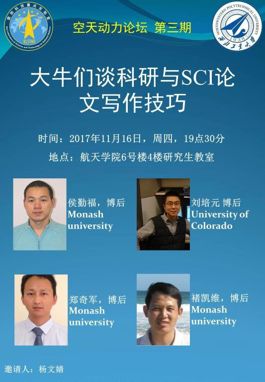 为响应学院积极开展学风建设的号召,2017年11月16日,空天动力研究所组合动力课题组在3003新葡的京集团6号楼4楼研究生教室举办了“飞天讲堂”活动。此次活动的主题是“科研经历分享与SCI论文写作技巧”,旨在提升课题组研究生的科研能力和论文写作能力。